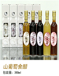 本次开发的山葡萄食醋只使用100%山葡萄,所以具有了卓越的味道和香气,非常易于食用,作由于具有比葡萄酒更加美丽的色彩和自然醇香的果实食醋,任何人都会容易喜欢食用。